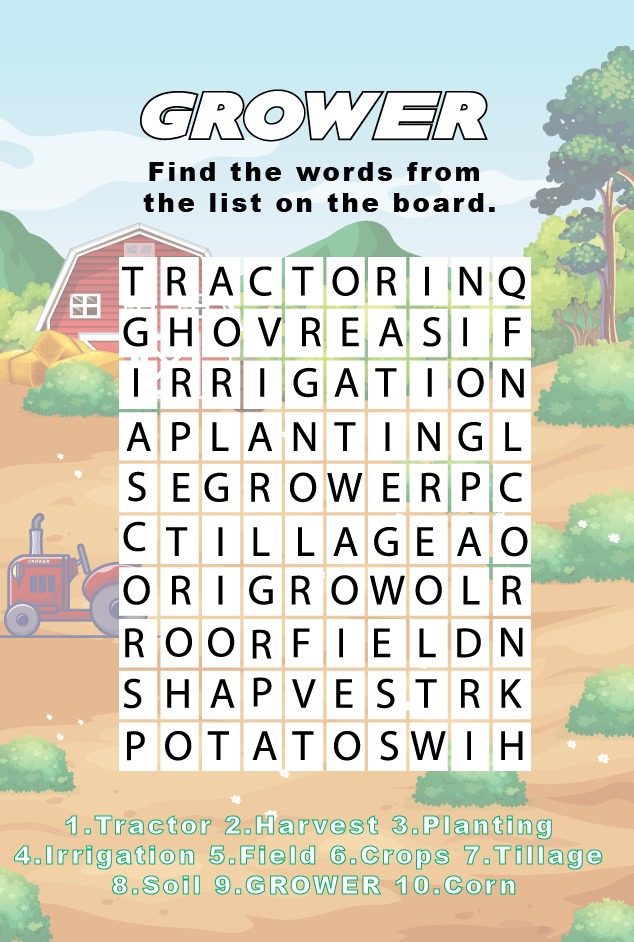 Here, you can download exciting word search puzzles featuring farming, tractors, and GROWER – related words. Simply download the PDF, print it out, and start searching for hidden words!